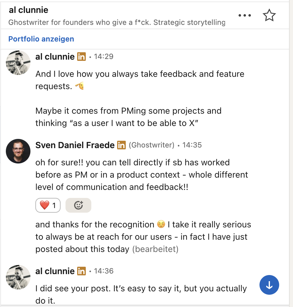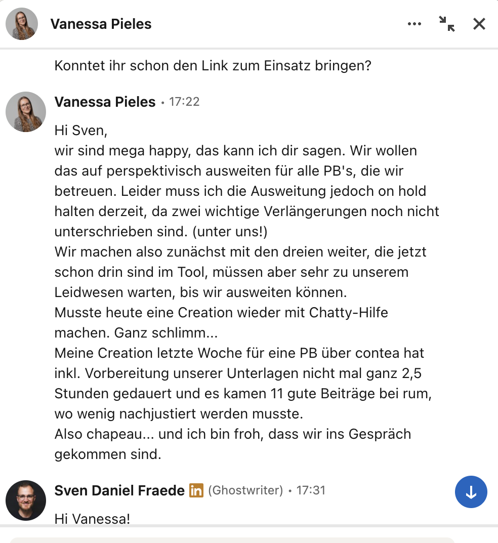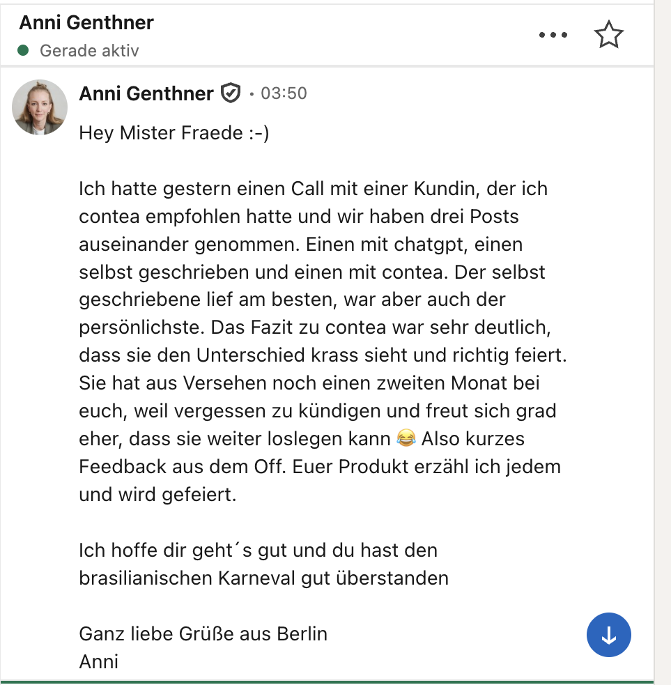 Asynchroner Kunden-Input✅ Wertvollen Input neben Content-Interviews erhalten – oder wenn keine Zeit für Calls ist. Aus dem Auto, zwischen Meetings.❌ Alte Posts recyclen, weil das Content-Interview wieder abgesagt wurde.