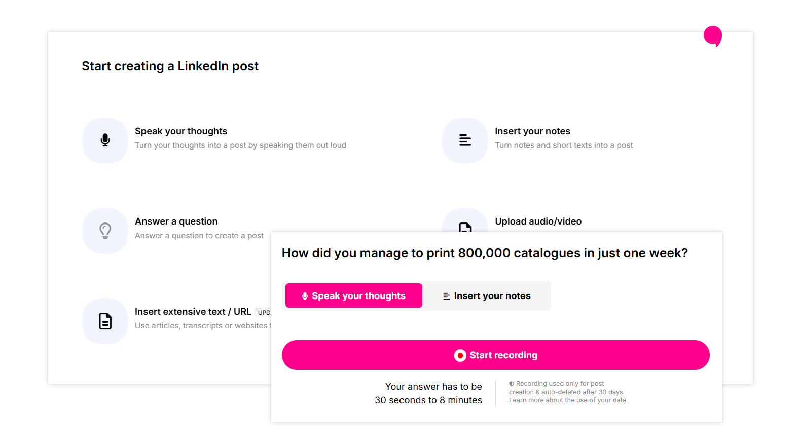 Create posts with a voice memo β as easy as a WhatsApp to a friend.